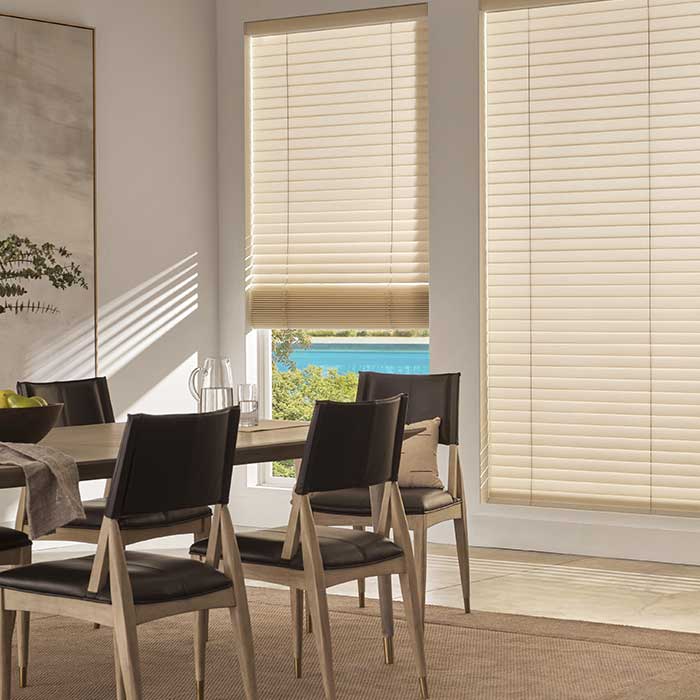 Yes, blinds are considered a classic type of window covering. They can add a beautiful design element at the window. Real wood blinds are available with painted or stained wood finishes, creating a designer look. Faux wood blinds are a popular choice for their wood grain appearance or painted finishes. Metal blinds coordinate beautifully and offer a metallic accent for contemporary styling. The fabric blinds we offer come in a variety of neutral colors and textured fabrics to complement the look of your home.