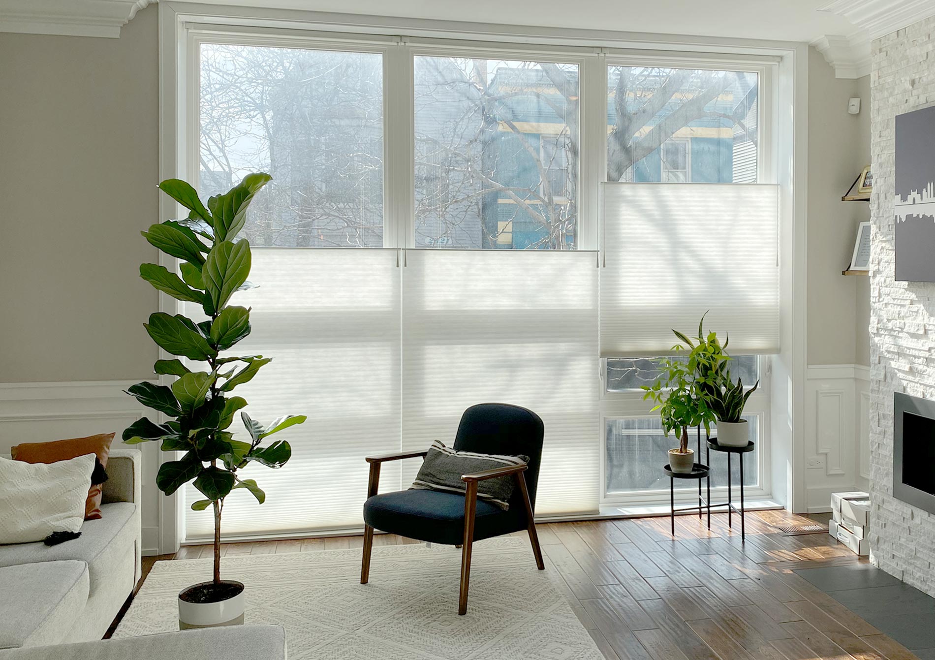 There’s almost nothing better than the combination of covered windows + sunshine. It creates an environment of private living without sacrificing sunlight. Windows that face direct light? Cover the majority of the window throughout the day, as light enters. Top down bottom up cellular shades keep the exhausting heat and glare out. East or West-facing windows? Lower slightly from the top while the sun is intense. Then, for the portion of the day without direct light, you can bring the top down bottom up roman shades further down, customizing the amount of light while staying private. North-facing windows may need less adjustments, as you don’t have to block direct rays, but just want a continual balance of privacy on the bottom and lighting at the top.